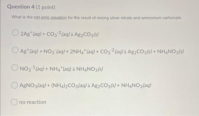 Solved Question 4 1 Point What Is The Net Ionic Equation Chegg Com